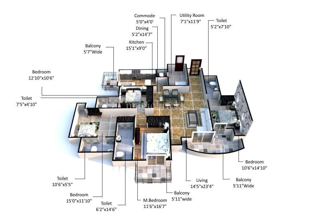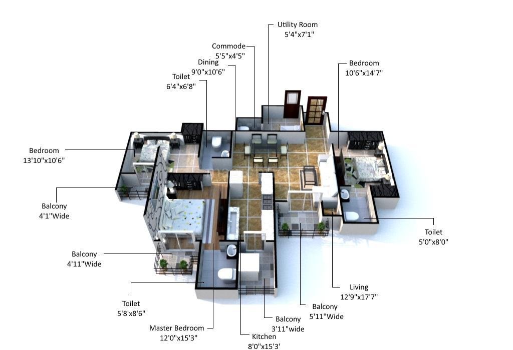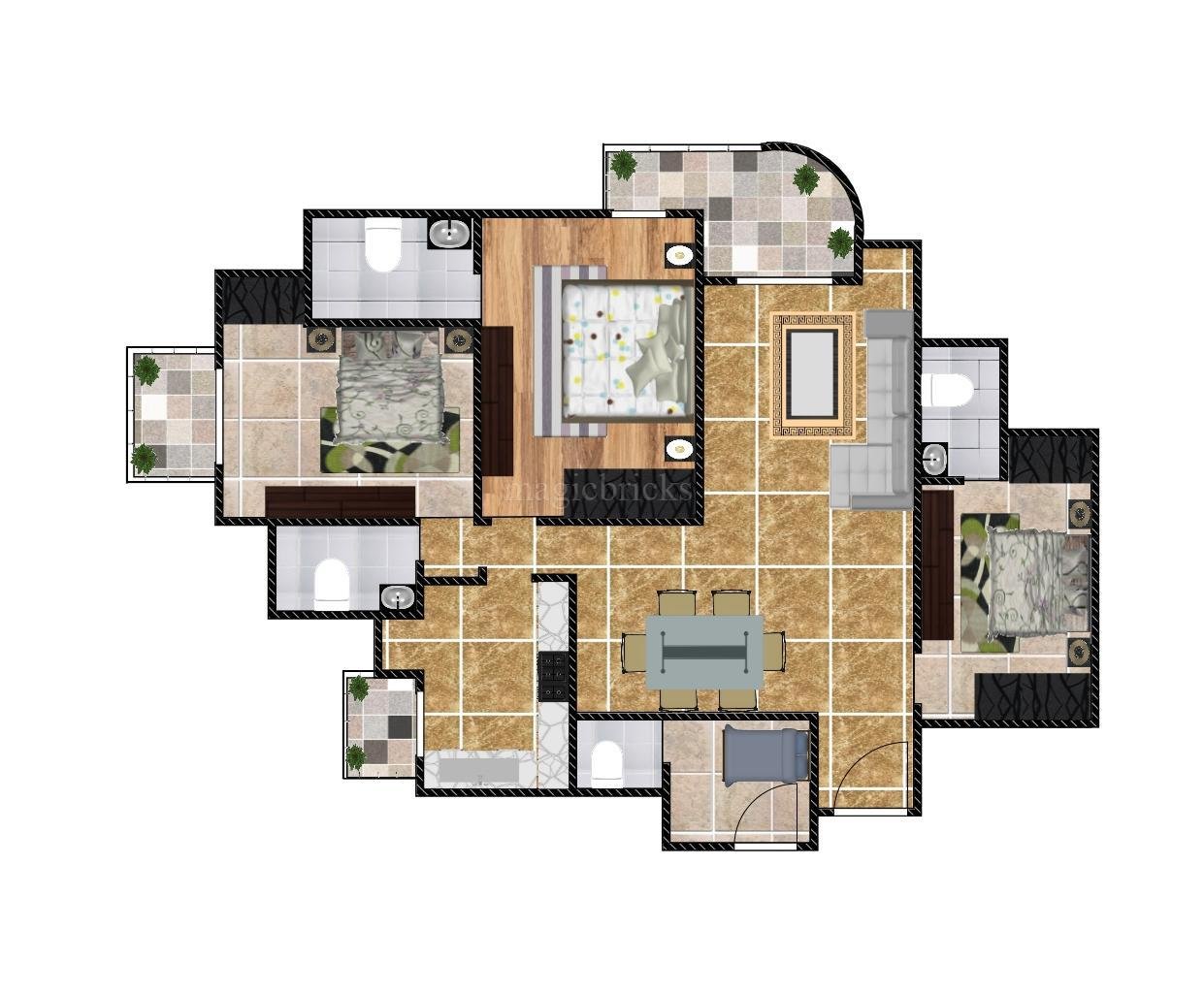 • 3 BHK Flat: 1983 sq ft with well-laid balconies and modern bathrooms.